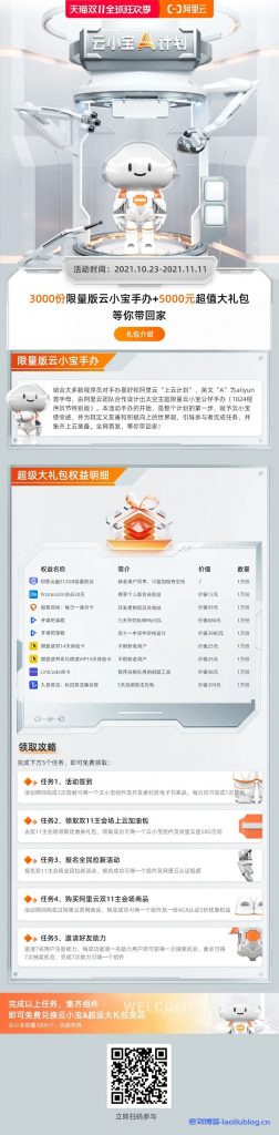 阿里云官网注册用户皆可参与活动,活动时间为2021年10月24日0点至2021年11月11日24点(具体活动时间可能有调整,以活动页面实际展示为准),完成任务即可免费获得云小宝+5000元超值权益大礼包!