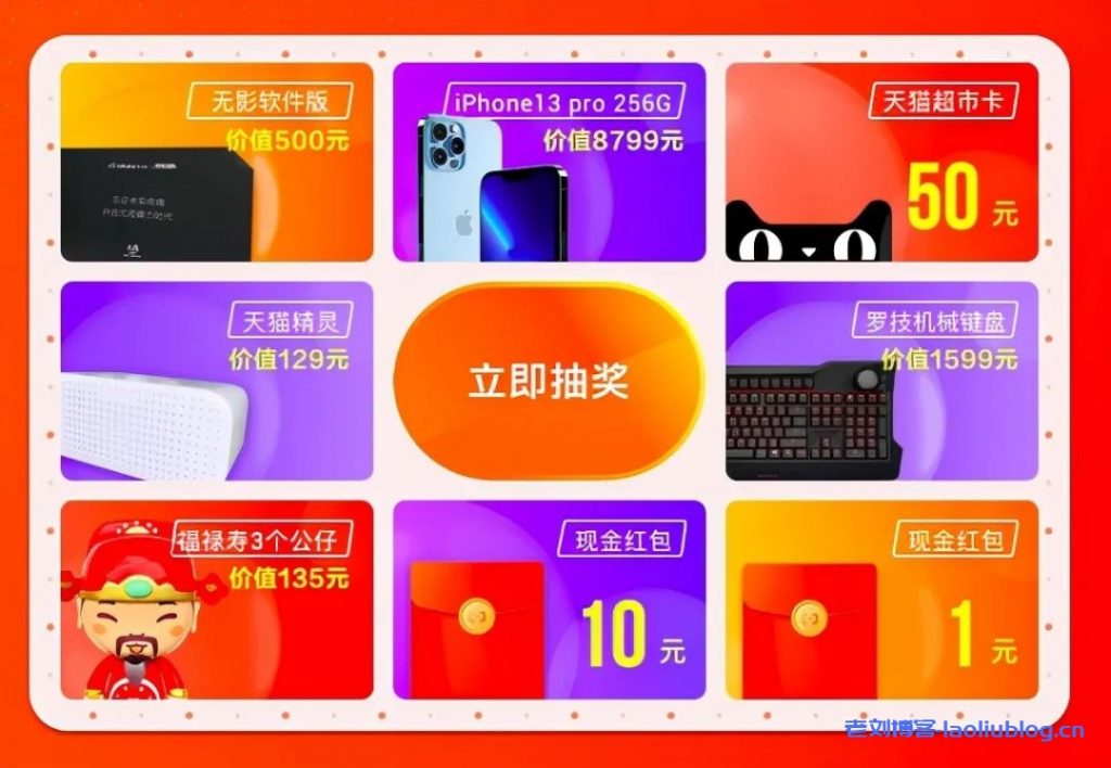 iPhone13 Pro 256G 手机(颜色随机)、机械键盘、福禄寿淘公仔套装、天猫精灵智能音箱方糖、50元天猫超市卡、阿里云“无影云电脑”软件版、现金红包10元、现金红包1元等;