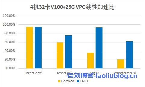 - 在相同的 25G VPC 环境下,相比于业内开源方案 Horovod,TACO 可以提供20%- 200%左右的性能提升。基本上模型参数越多,性能提升越明显;