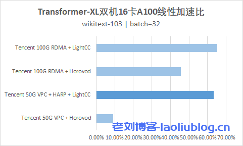 下图展示了,无论是 ResNet50 还是 Transformer-XL,在双机16卡A100的训练环境下,CVM 实例(GT4.41XLARGE948 + 50G VPC)通过 HARP 加速后,能够提供接近黑石 100G RDMA 产品(HCCPNV4h )的性能。