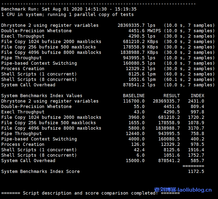 UnixBench测试了系统调用、读写、进程、图形化测试、2D、3D、管道、运算、C库等性能,是一个比较综合性测评机器性能的工具,这里具体各个性能数据不用作分析,这里我们只需要看最后的跑分结果。得分小于400的性能比较差、500-1000正常、大于1000优秀、大于2000极好。当然跑分不是认定机器好坏的唯一标准,需要综合考虑。此次跑分为1172.5>1000,机器性能优秀。