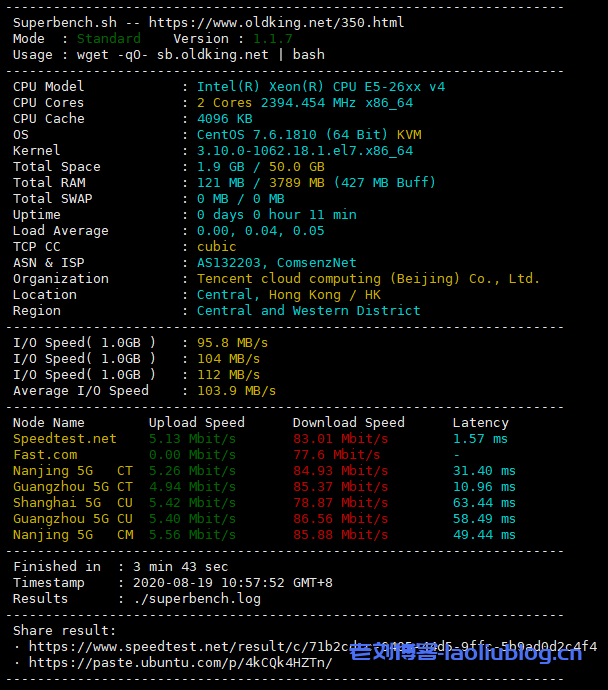 老刘这里用SuperBench脚本测试了腾讯云香港标准型S2服务器。测试结果包括机器基本配置信息,I/O读写性能和国内地区上传下载速度以及网络延迟情况。