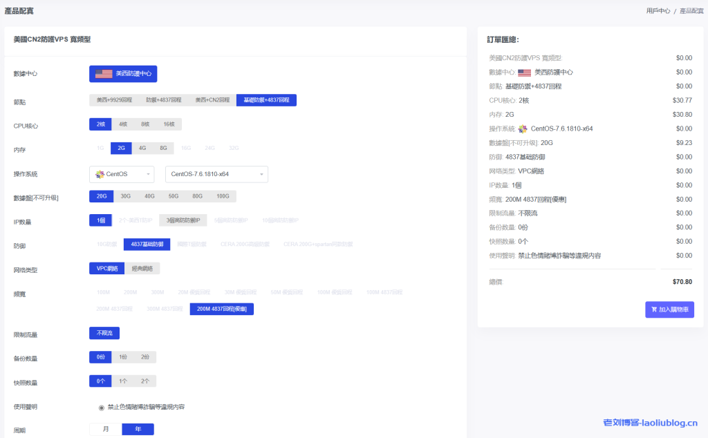 萝卜数据美国机房购买地址是一样的,购买的时候在节点这里选择美西+9929回程,默认20M带宽,可以选择国际T级防御或者CERA 200G高级防御;选择防御+4837回程,默认100M带宽,是CERA 200G+spartanhost斯巴达同款防御;选择美西+CN2回程,默认20M带宽,是10G防御。