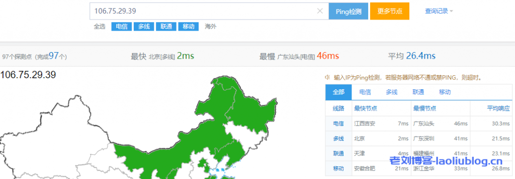 本次测评老刘博客选择的是UCloud北京二可用区E的快杰型S云主机,外网IP是106.75.29.39。以下是老刘对该IP进行ping测试和三网测速结果。