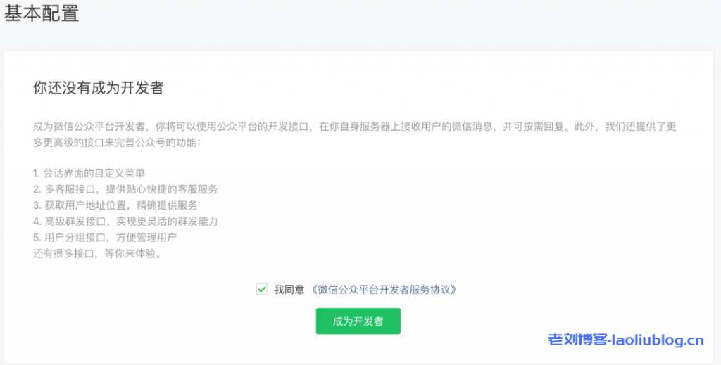 首先肯定需要有一个订阅号,然后在订阅号后台点击 开发者->基本配置进入如下页面,点击确定