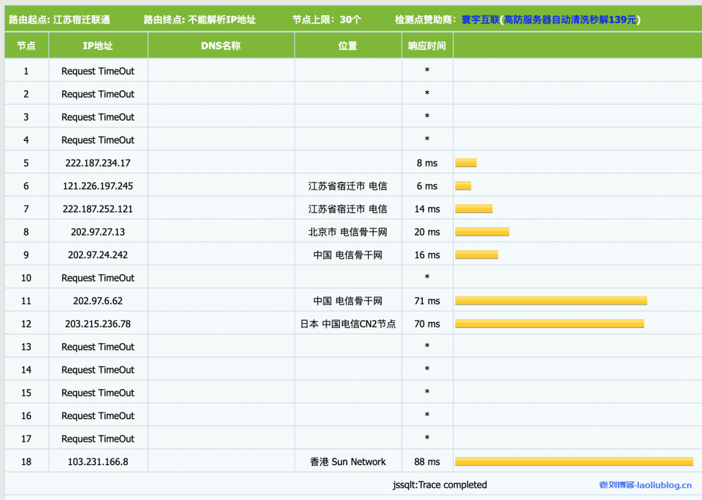 traceroute to 211.139.0.10 (211.139.0.10), 30 hops max, 60 byte packets 1 103.231.166.1 0.69 ms http: json http: json 2 * 3 63.140.7.57 0.95 ms http: json http: json 4 59.43.246.181 1.05 ms http: json http: json 5 59.43.248.249 4.75 ms http: json http: json 6 * 7 59.43.130.105 8.48 ms http: json http: json 8 * 9 * 10 * 11 221.183.54.49 40.22 ms http: json http: json 12 221.183.90.161 23.64 ms http: json http: json 13 211.139.0.10 26.83 ms http: json http: json ----------------------------------------------------------------------